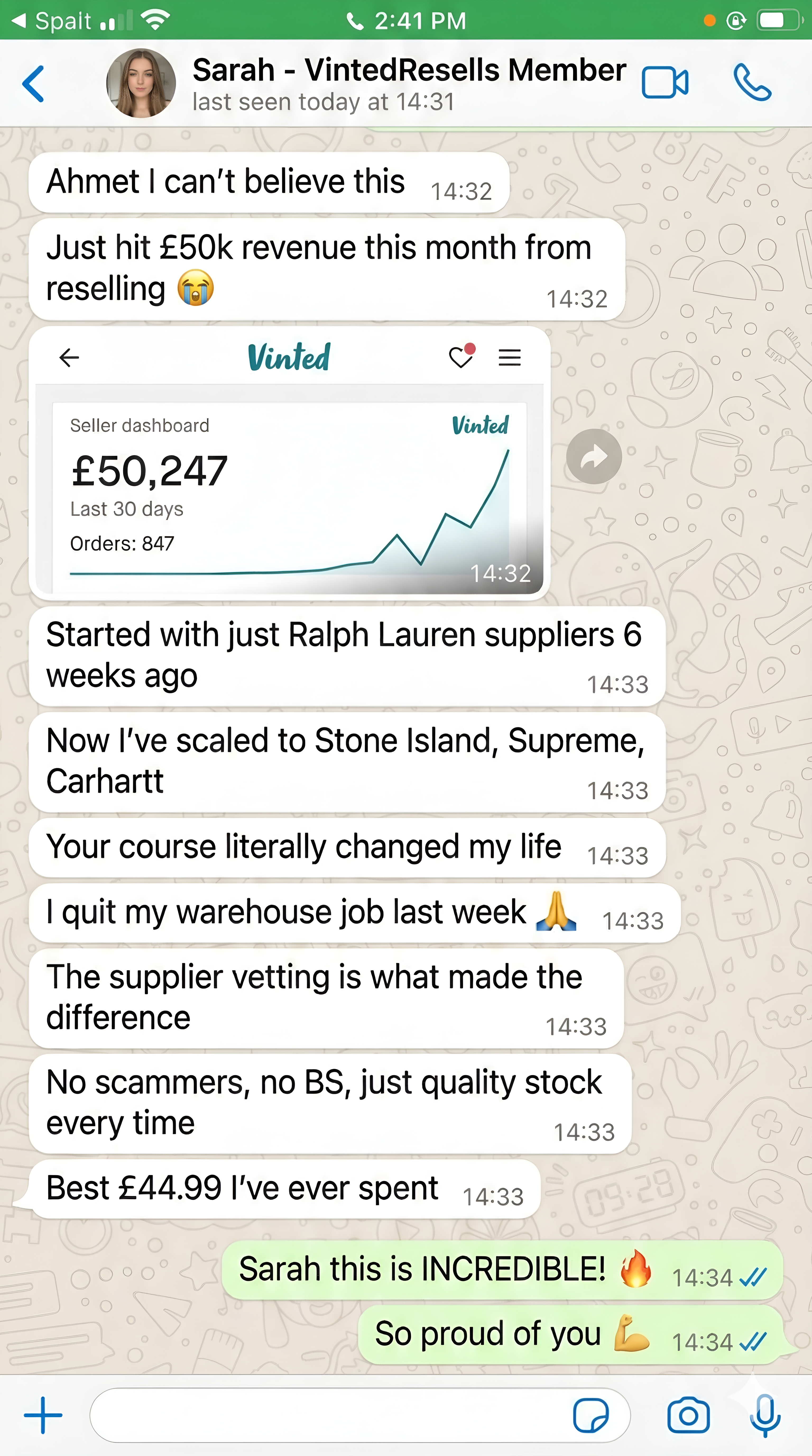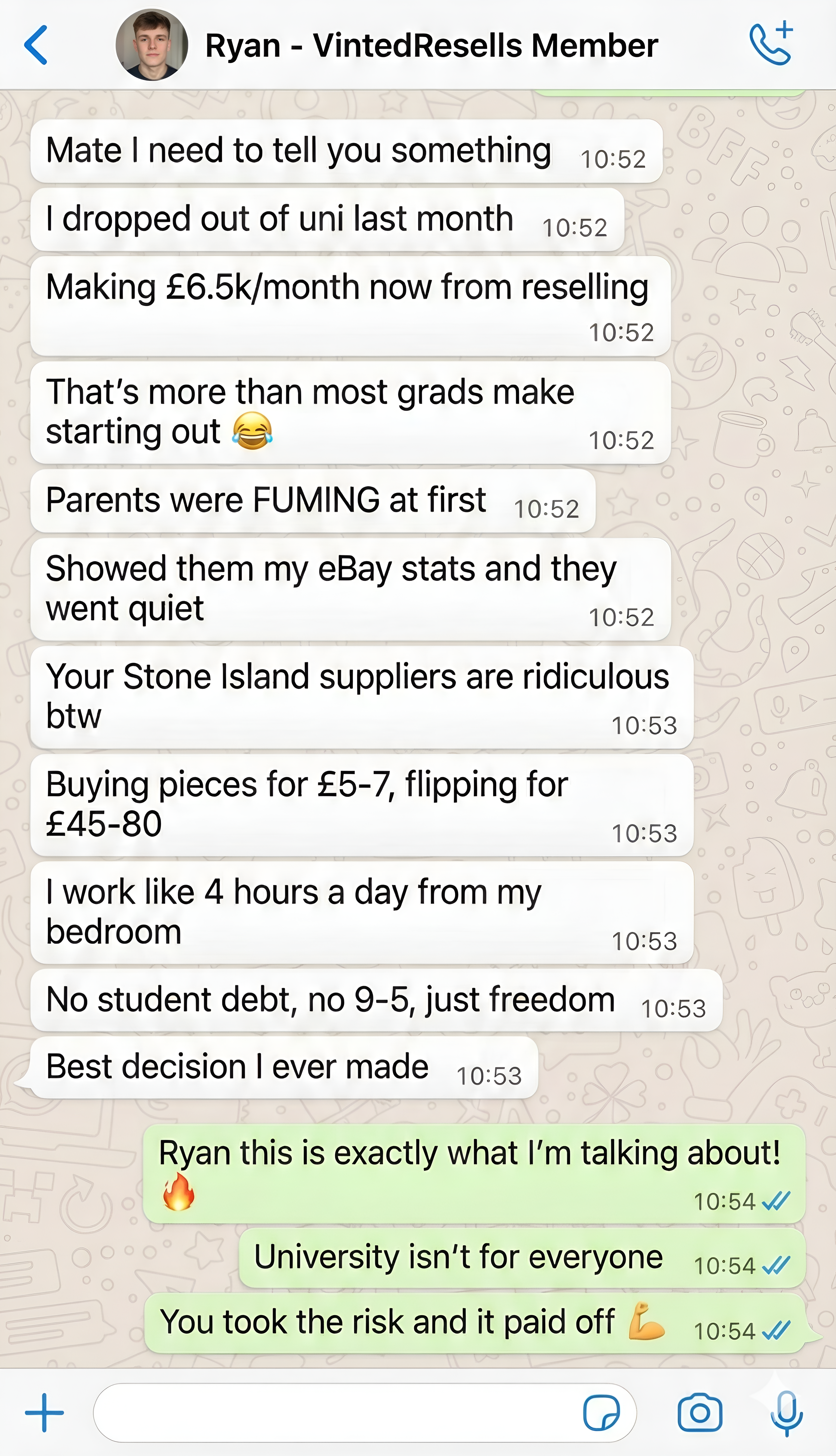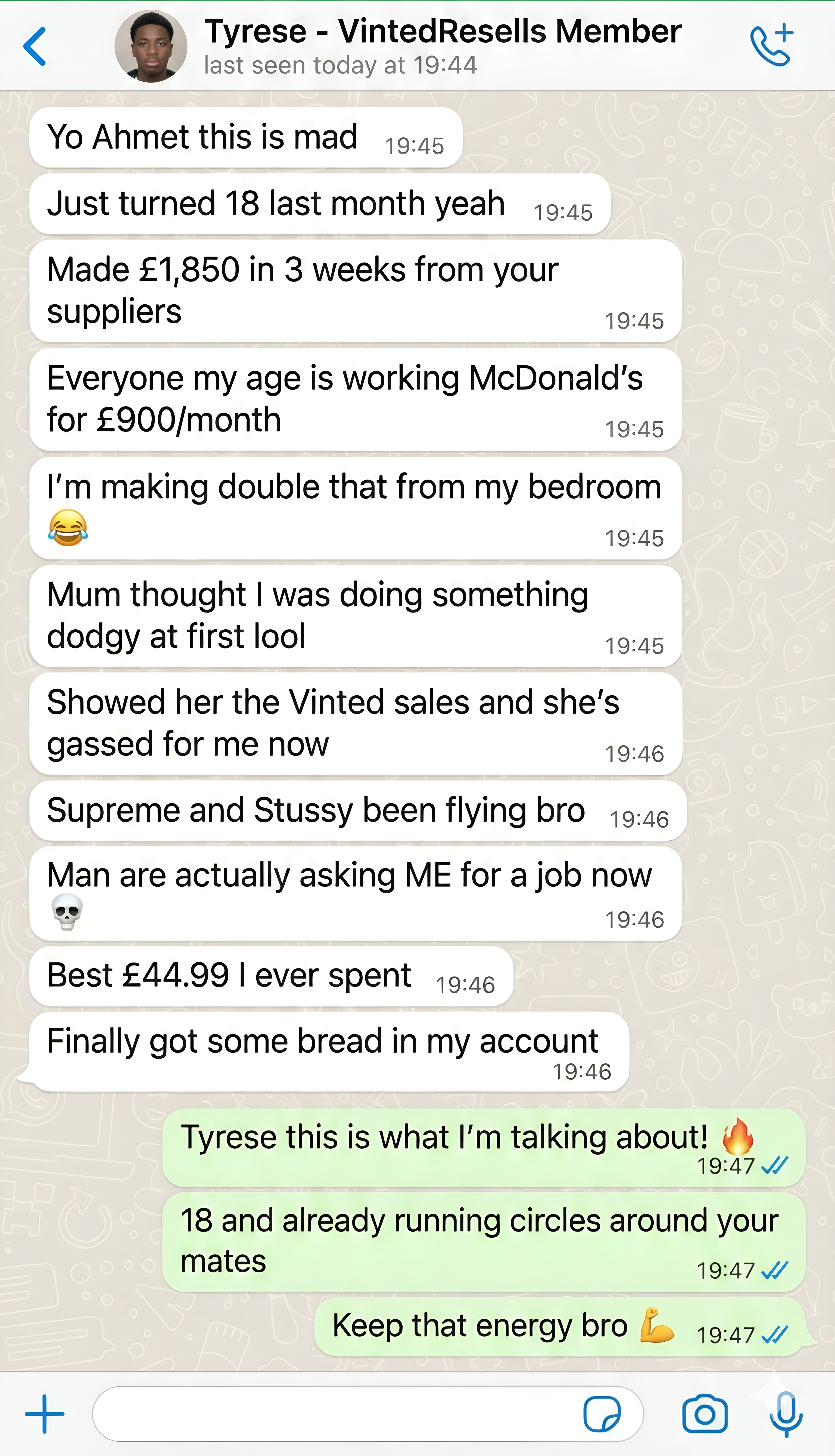 No. Zero experience needed. Our £300 course (included FREE) walks you through everything step-by-step: how to contact suppliers, how to order inventory, how to photograph items, how to price for profit, how to list on Vinted/Depop/eBay, how to handle customers, how to scale up. If you can follow instructions and use your phone camera, you can do this. Most of our successful members had never resold anything before starting.